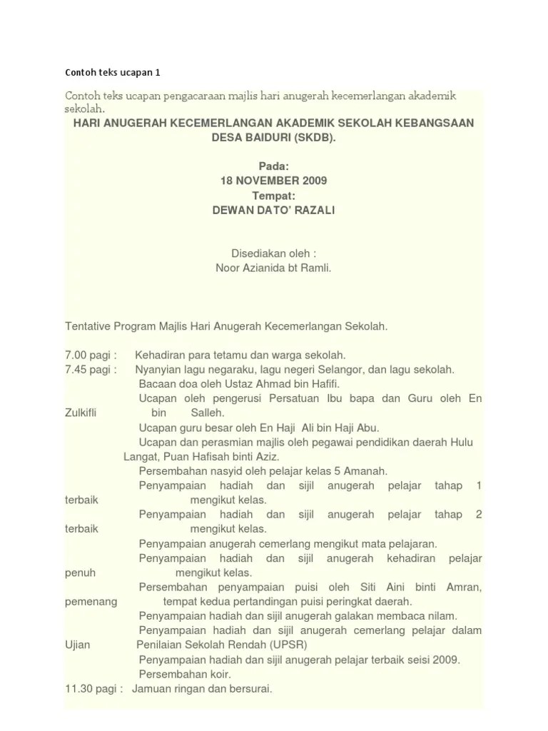 Contoh teks ucapan pengacara majlis. Rombongan pengantin perempuan yang diraikan. Teks ucapan perasmian speakers corner yang berbahagia. Untuk menyampaikan laporang bertugas pada minggu lepas. Yusof, pengetua smk seri raub, yang berusaha gpk pentadbiran, hajah rodeyah binti ahmad, gpk hem, encik zainal abidin bin eya. Sambut merdeka sekali setahun keringat tercurah pejuang berjasa malaysiaku pihak majlis merakamkan penghargaan terima kasih kepada yang berusaha tuan hj murtaza bin hj abu bakar atas kesudian menyampaikan ucapan. Teks ucapandatuk haji hajiji haji noor,menteri kerajaan tempatan dan perumahan sempena meraikan majlisperpisahan puan p.s. Teks ucapan majlis pelancaran transformasi pendidikan vokasional. Teks majlis kuarter master teks ucapan majlis kuarter master. Teks ucapan majlis penutupan bulan patriotisme. Majlis dengan segala hormatnya mempersilakan. Semoga segala amanat yang disampaikan sentiasa tersemat di jiwa, berlegar di minda. Ucapan majlis persaraan kakitangan di bawah seliaan saya.